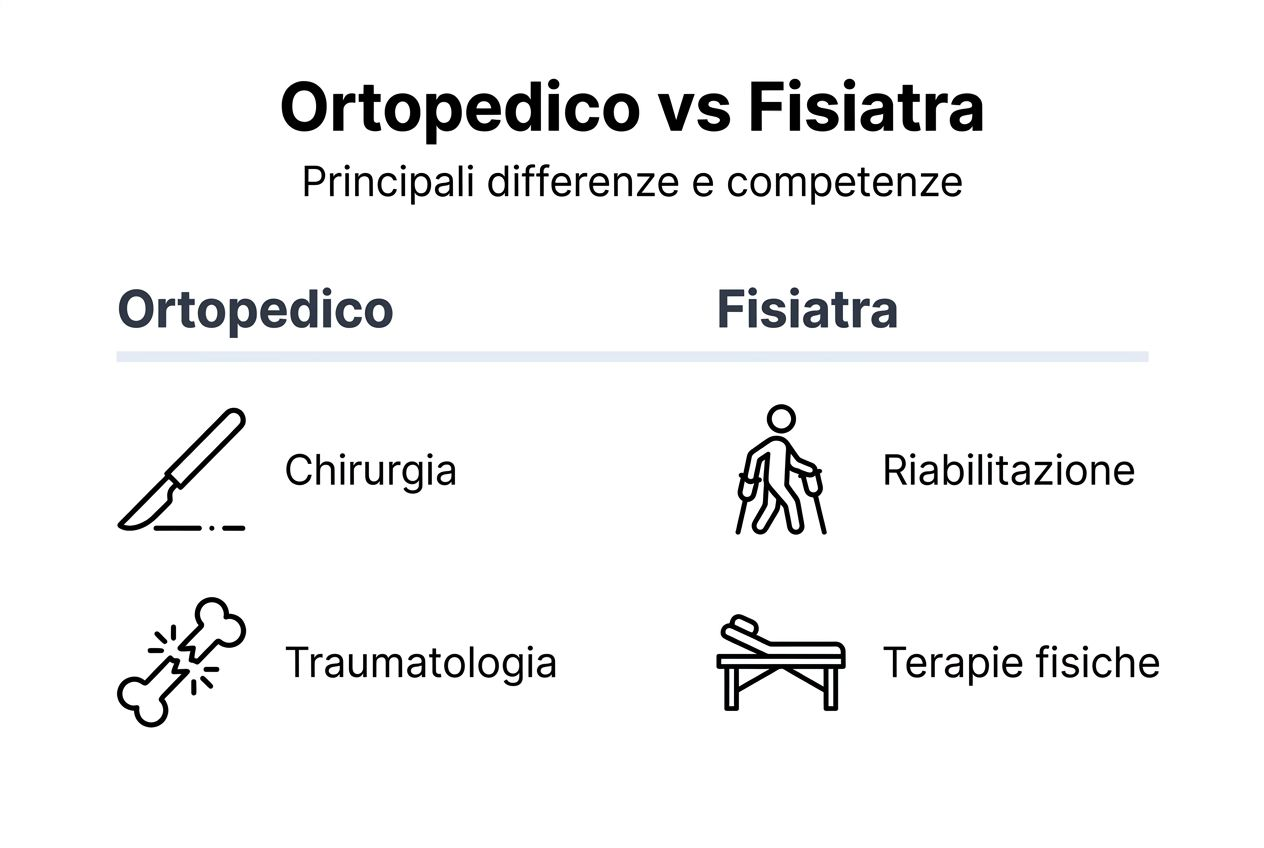 L'ortopedico è specializzato in diagnosi e trattamenti chirurgici delle patologie muscoloscheletriche, mentre il fisiatra si concentra sulla riabilitazione e gestione non chirurgica. L'ortopedico interviene principalmente su problemi strutturali che richiedono correzione anatomica, il fisiatra ottimizza la funzione motoria attraverso terapie conservative.