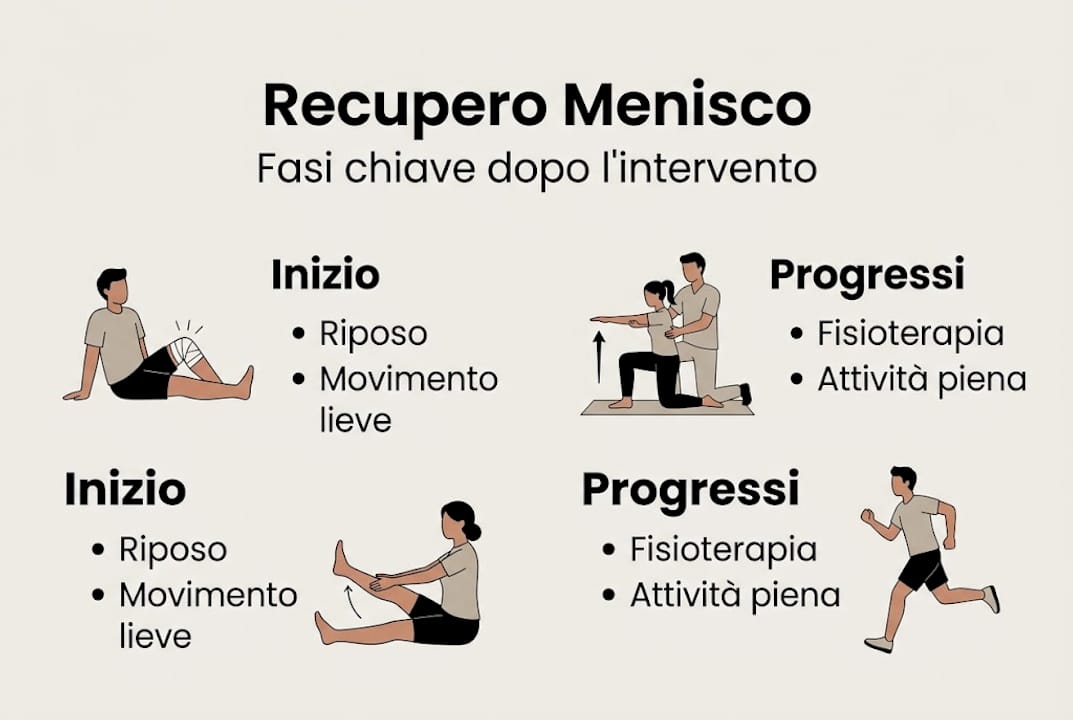 Il recupero completo richiede in media tra 4 e 8 settimane per la meniscectomia, con fisioterapia guidata. La qualità della riabilitazione influenza fortemente il risultato finale e i tempi reali di ritorno alle attività.