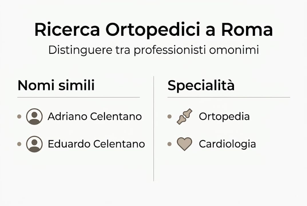 Tra i risultati più comuni troviamo: Adriano Celentano (cantante), Eduardo Celentano (cardiologo a Bergamo e Napoli), Giuseppe Celentano (urologo), Marcello Celestini (ortopedico e fisiatra a Roma), Vittorio Candela (specialista della spalla al Policlinico Umberto I di Roma), e vari professionisti non medici con il nome Umberto Celentano attivi nel settore IT. Questo panorama frammentato può disorientare anche il paziente più attento.